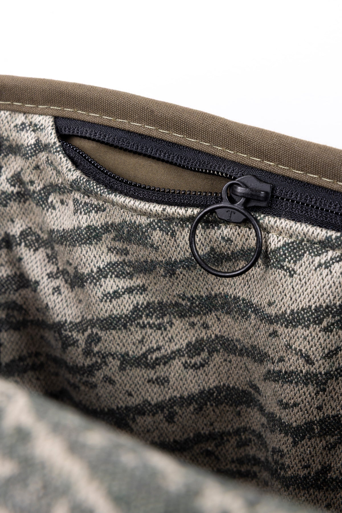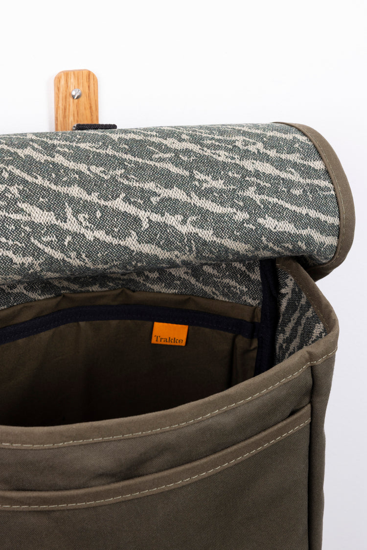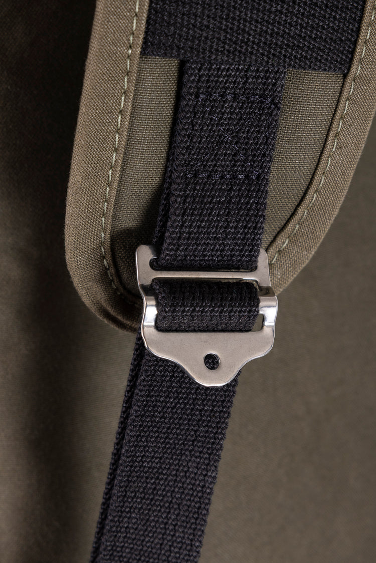 The exterior is crafted from dry waxed cotton canvas, chosen for its weather resistance and tactile, matte finish. Over time, the fabric softens and develops a natural patina, marking the rhythm of daily use. Inside, a wool-backed camouflage lining is bonded directly to the outer shell, forming a single composite fabric. This construction enhances structure, improves durability and creates a neat internal finish without loose or shifting layers.